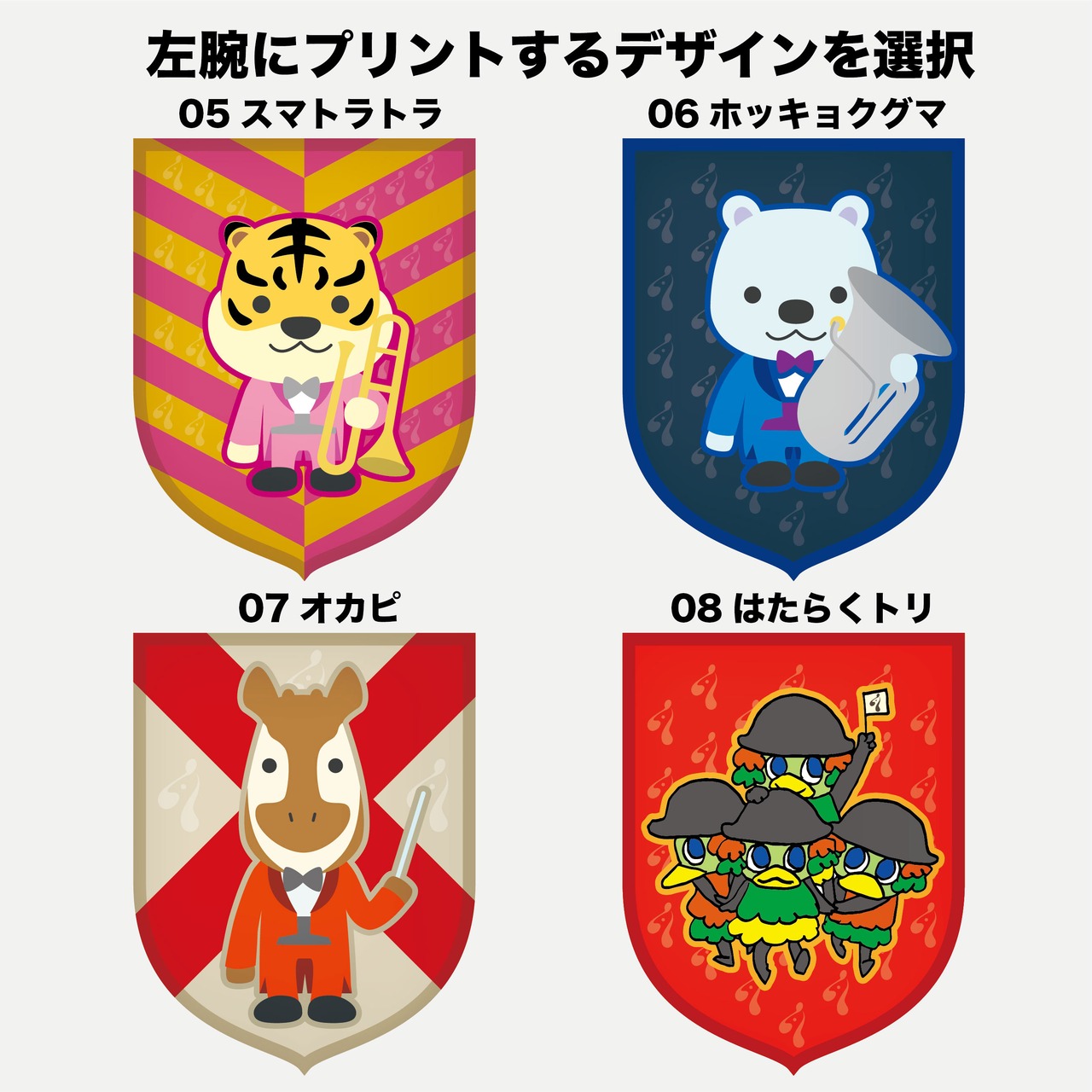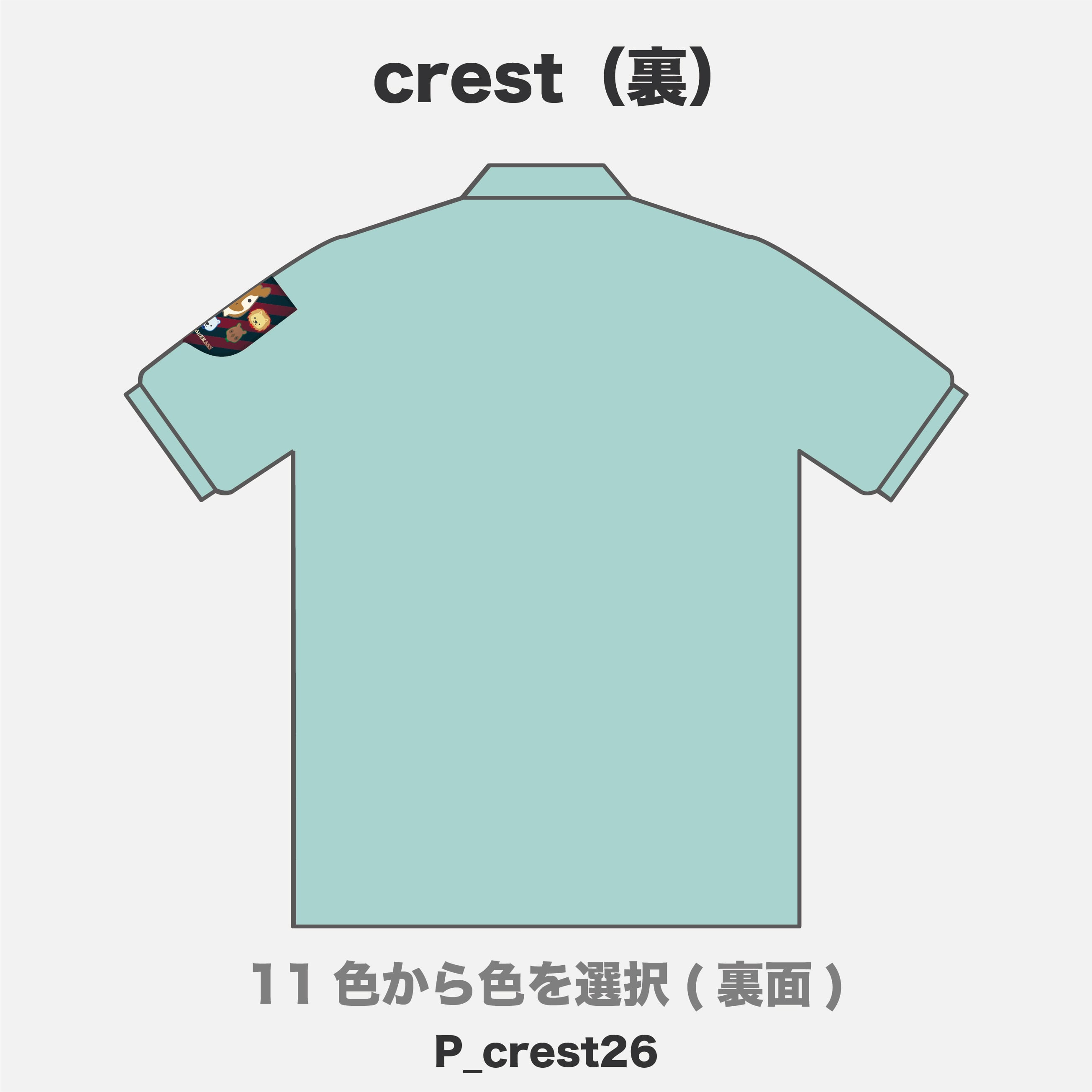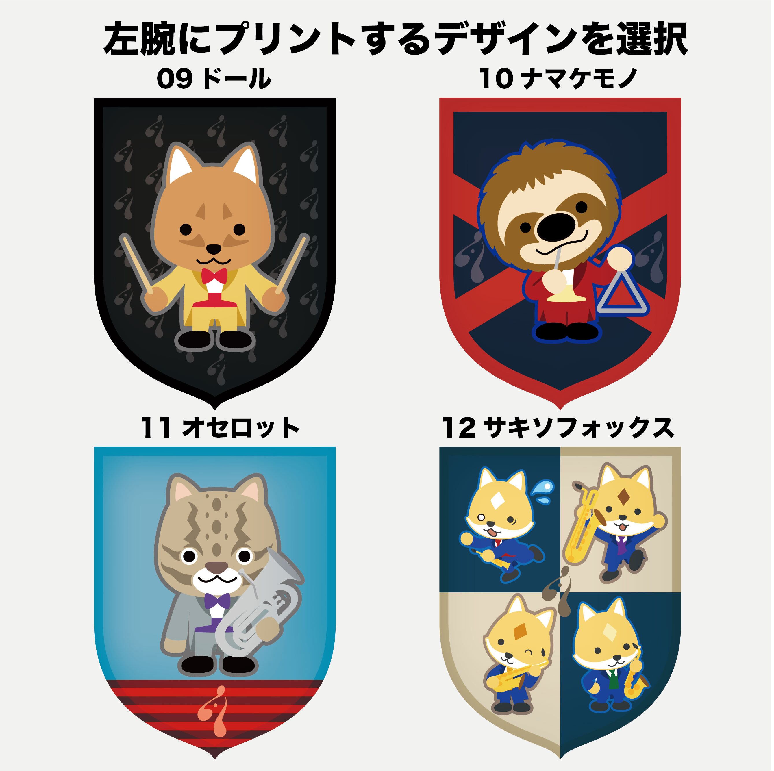 胸元にオカピマーク、左腕にそれぞれのキャラクターのクレストがプリントされたポロシャツです。左腕のデザインは自由に選択ください。